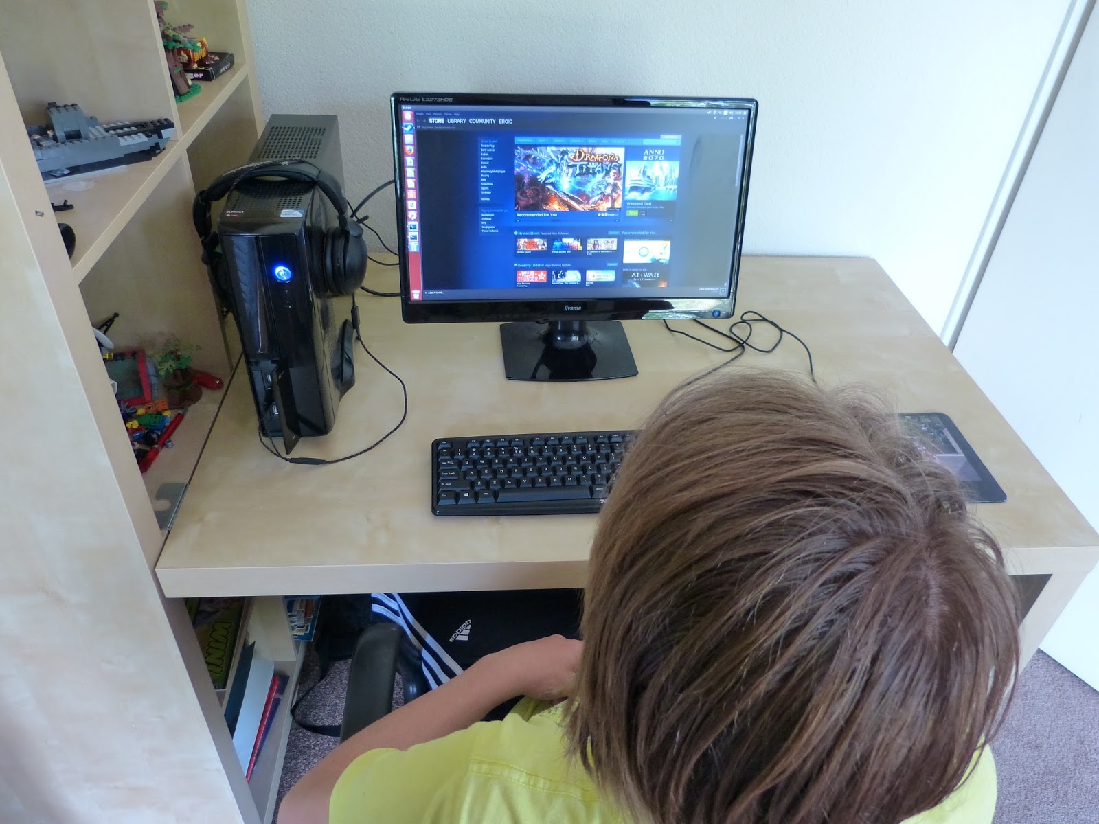 | My son behind his PC running Steam on Ubuntu. He’s quiet happy with the speed of the system right now. |