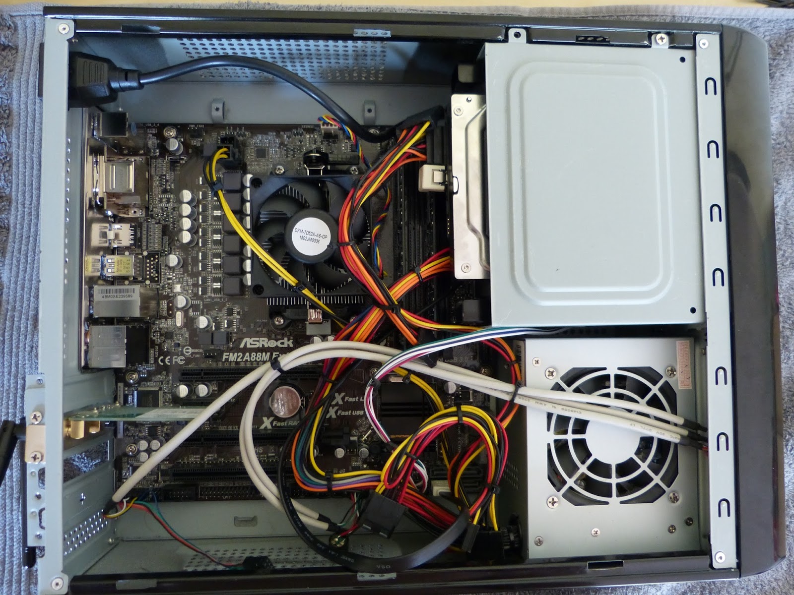 The ASRock board fits in the case but everything is so cramped that there is hardly any room left for the cables. One look at the image below of the inside of the case shows that this is not my finest hour in PC builds but it works. Getting the software to work was a bigger problem. Linus Mint that was already on the HD could only be started in recovery mode. After a couple of tries I gave up and installed a fresh version of Ubuntu 14.04LTS (which is somewhat similar to Linux Mint). This worked perfectly. It appears that all hardware is supported by Ubuntu and the OS is very zippy.