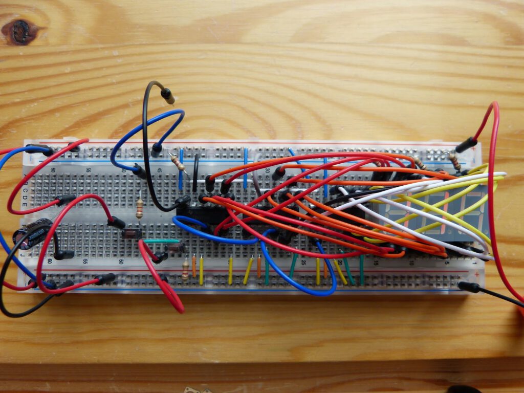 When I applied voltage to the circuit for the first time a problem occurred. The display immediately showed random numbers although I did not touch the tactile switches. A closer examination of the circuit showed me the cause of this problem. The pull-down resistor of the push button clock input of the first counter was not properly connected. This problem was easily fixed and the circuit worked then flawlessly however with one mistake. I had connected the first decade counter to the leftmost digit instead of the rightmost.