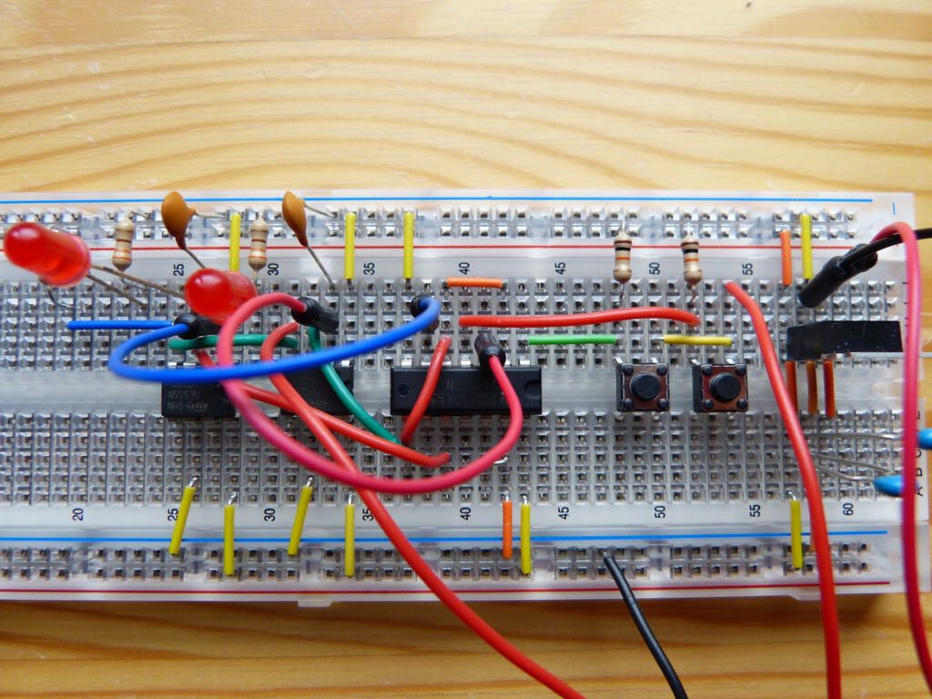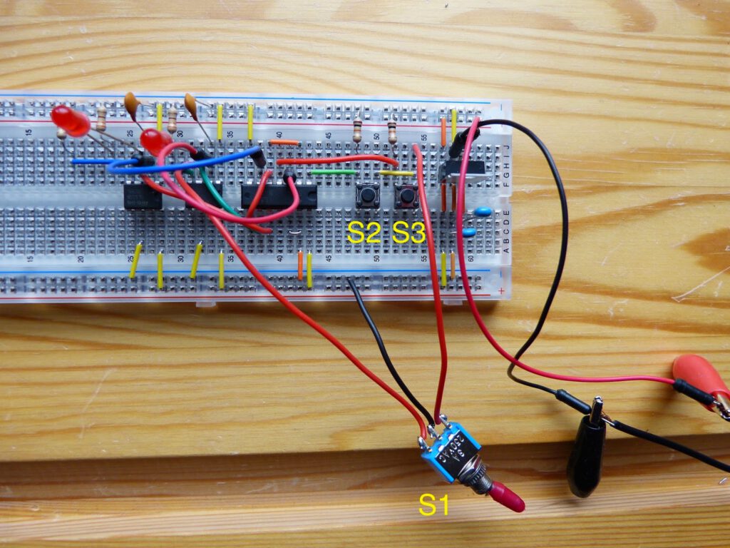 Compared to the previous experiment this circuit is relatively easy to build on the breadboard. Nevertheless, I made a mistake. I forgot to connect the output of the second OR gate of the 74HC32 chip to the second 555 timer. As a consequence pushing S3 didn’t light up the second LED and the other button was not locked. After comparing the circuit on the breadboard with the schematic I discovered my mistake and corrected it.