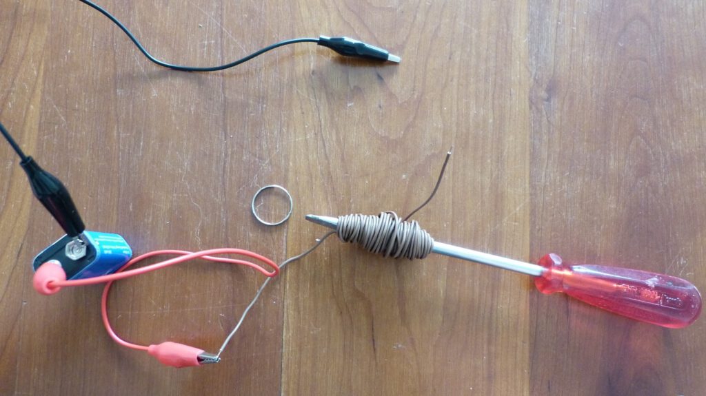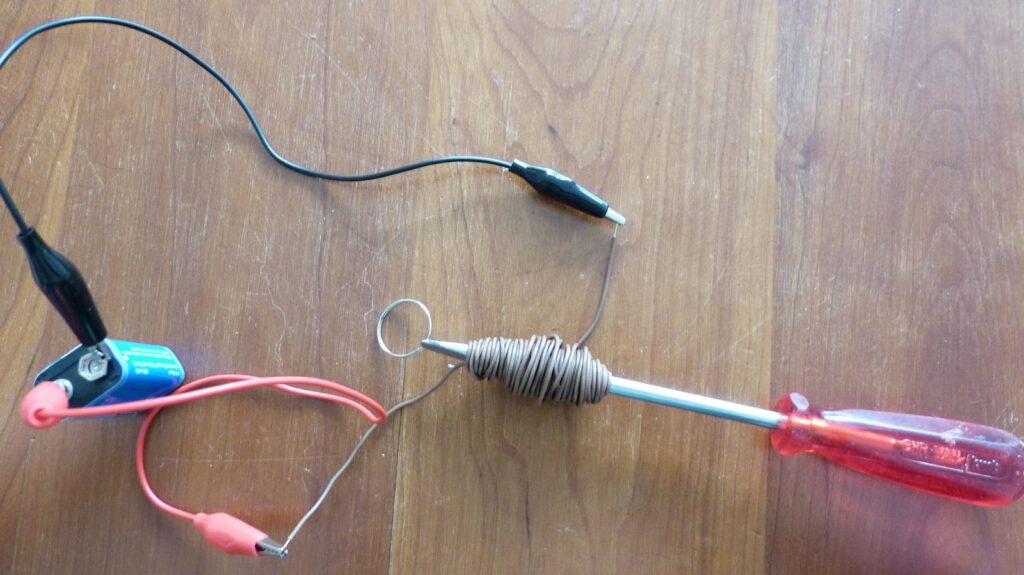 Experiment 25 demonstrates magnetism as an induced effect of electrical current through a wire. A long piece of wire is winded around the shaft of a screwdriver. The ends of the wire are connected to an AA battery (see image below). Due to the induced magnetism a paperclip or some other lightweight iron is attracted to the screwdriver. Very neat. This experiment in one form or the other can be found numerous times on the web. A nice example is Colin Cunninghams YouTube movie on the subject at https://www.youtube.com/watch?v=STDlCdZnIsw.